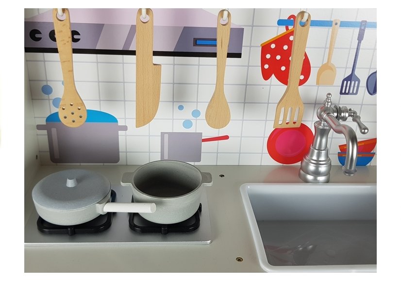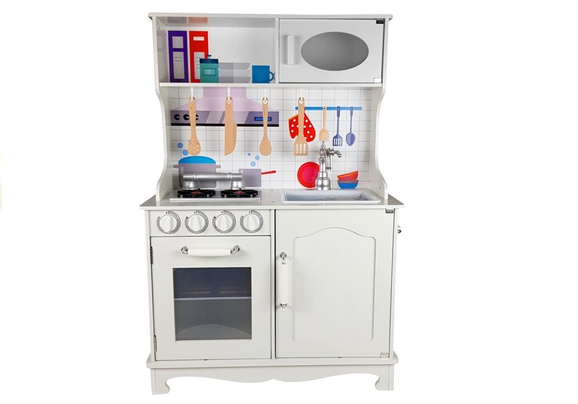 Drewniana, biała kuchnia charakteryzuje się ciekawym designem nawiązującym do pełnowymiarowej kuchni, którą każde dziecko zna ze swojego domu. Rysunki na ściankach kuchni przypominają klasyczne wyposażenie, co dodatkowo rozwija wyobraźnię dziecka. Drewniana kuchnia posiada ruchome elementy – otwieraną mikrofalówkę, piekarnik i szafkę, które z powodzeniem przydadzą się do przechowywania akcesoriów i imitacji produktów spożywczych.