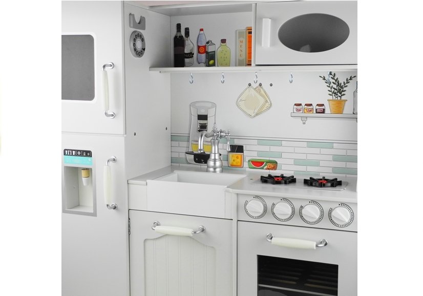 Biała, drewniana kuchnia dziecięca Nela inspirowana jest prawdziwymi kuchniami. Oparto ją na oryginalnie wyglądających nóżkach, natomiast w jej konstrukcji zawarto realistyczne elementy. Duże wymiary kuchni sprawiają, że będzie to fantastyczny zestaw dla rodzeństwa lub kilkulatka i jego najbliższych przyjaciół, a materiały, jakich użyto do produkcji zestawu, są przyjazne dla środowiska, odporne na zabrudzenia i wyjątkowo trwałe.