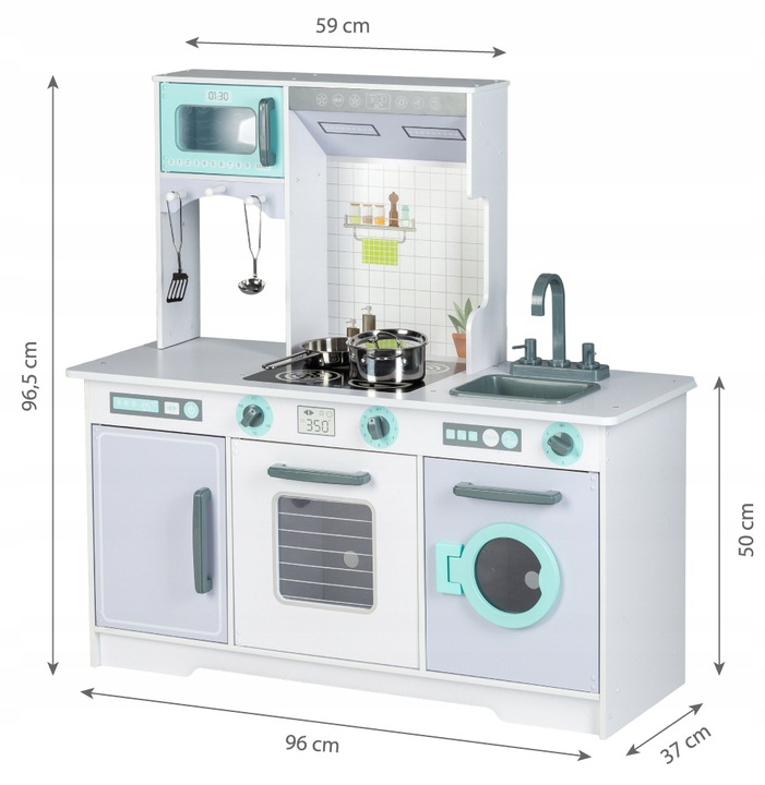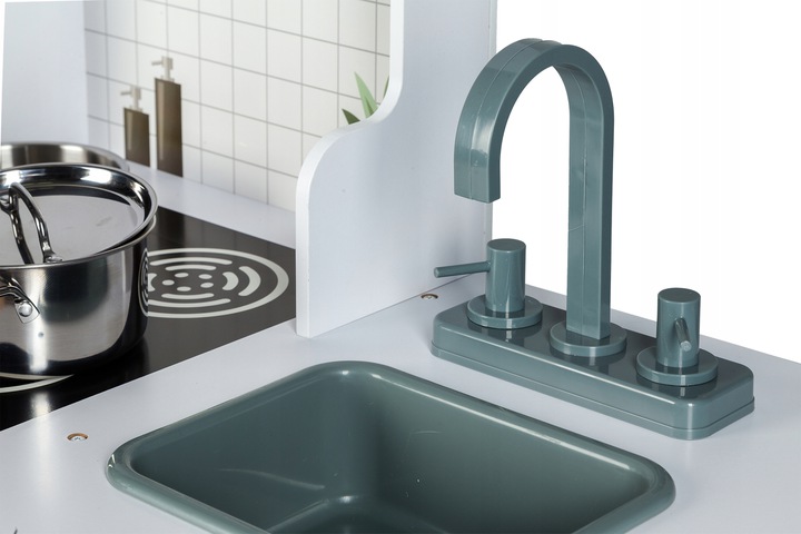 Kuchenkę wyróżnia również mnogość detali odwzorowujących realne urządzenia – 2 pstrykające pokrętła do palników i piekarnika, drzwi do piekarnika, mikrofali, pralki oraz szafeczek domykane przez system bezpiecznego domykania, zlew wraz z kranem i pokrętłami do wody. Dodatkowo dzięki szafce, półeczkom i haczykom zamontowanym na ściance, w kuchni zawsze powinien być utrzymany porządek.