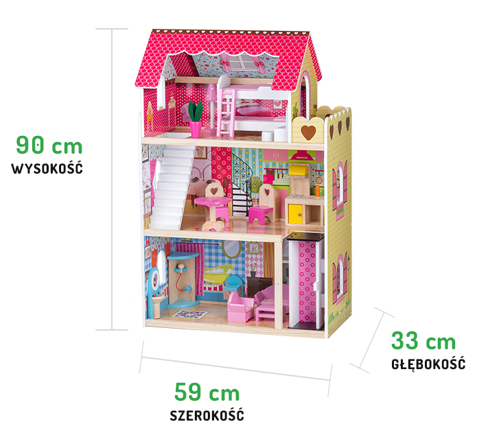 Wysokość domku ma około 90 cm, szerokość 60 cm, a głębokość 30 cm. Wysokość piętra wynosi 27 cm, a poddasza około 32 cm.
