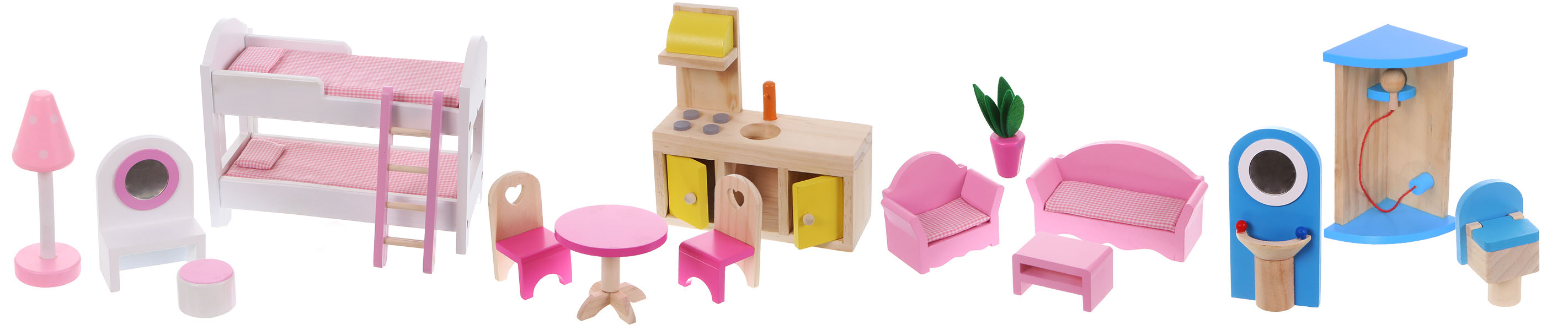 W skład zestawu wchodzi 16 drewnianych elementów – kolorowych mebelków wykonanych z niezwykłą starannością o detale i sprzętu do wyposażenia poszczególnych pomieszczeń. Są to: