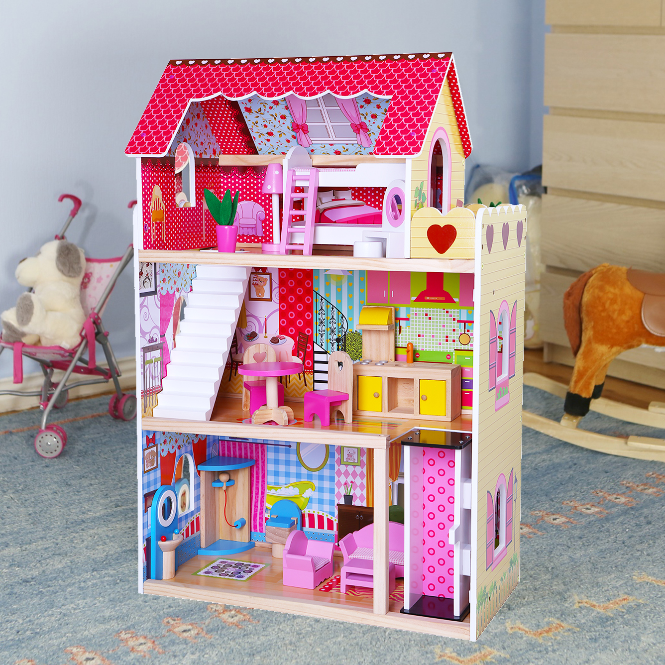 Rezydencja ma 5 pomieszczeń, które rozmieszczone są na 3 niezależnych kondygnacjach. Całość jest tak zaprojektowana, że pełni rolę komfortowego domu dla lalek.