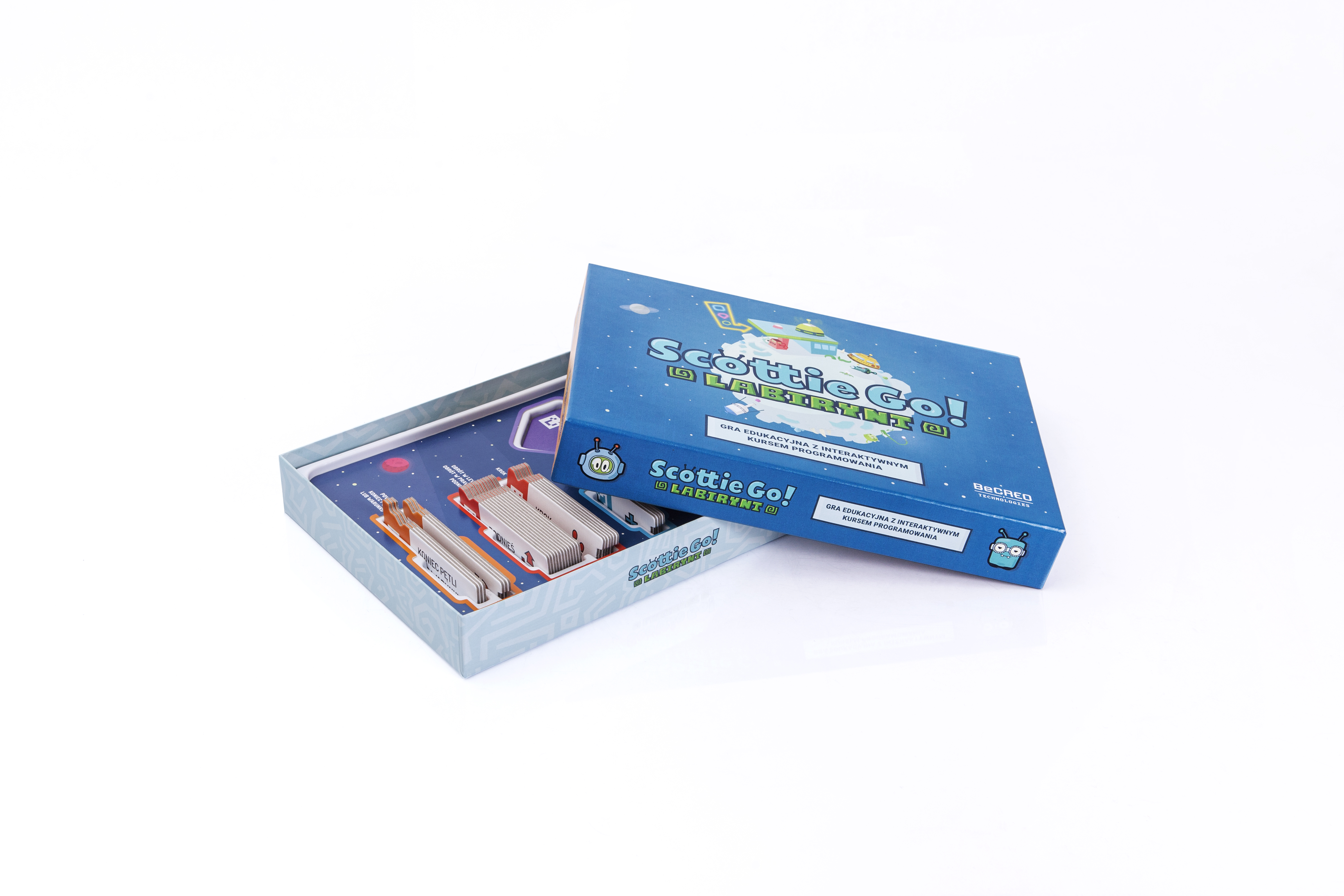 Scottie Go! Labirynt to innowacyjne połączenie multimedialnej aplikacji edukacyjnej na urządzenia mobilne i kartonowych klocków do sterowania bohaterem. Kinestetyczny aspekt zabawy pozwala na przełamywanie barier związanych z poznawaniem abstrakcyjnych pojęć i sprzyja pracy w grupie. Starannie zaprojektowane środowisko gry stopniowo wprowadza użytkowników w świat programowania i rozwijają intuicję algorytmiczną podczas wykonywania zadań o rosnącym poziomie trudności.