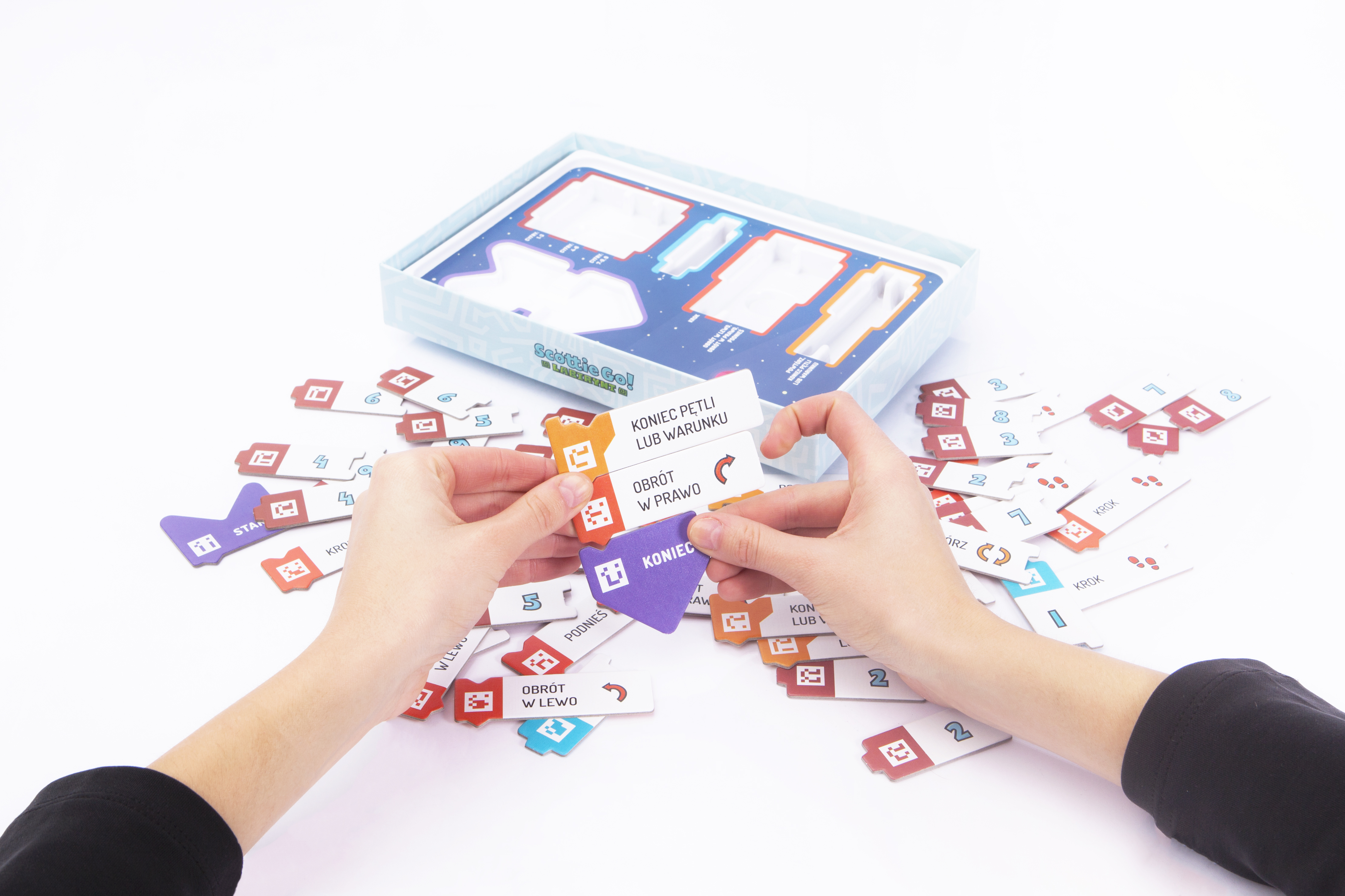 - 57 kartonowych klocków do sterowania bohaterem