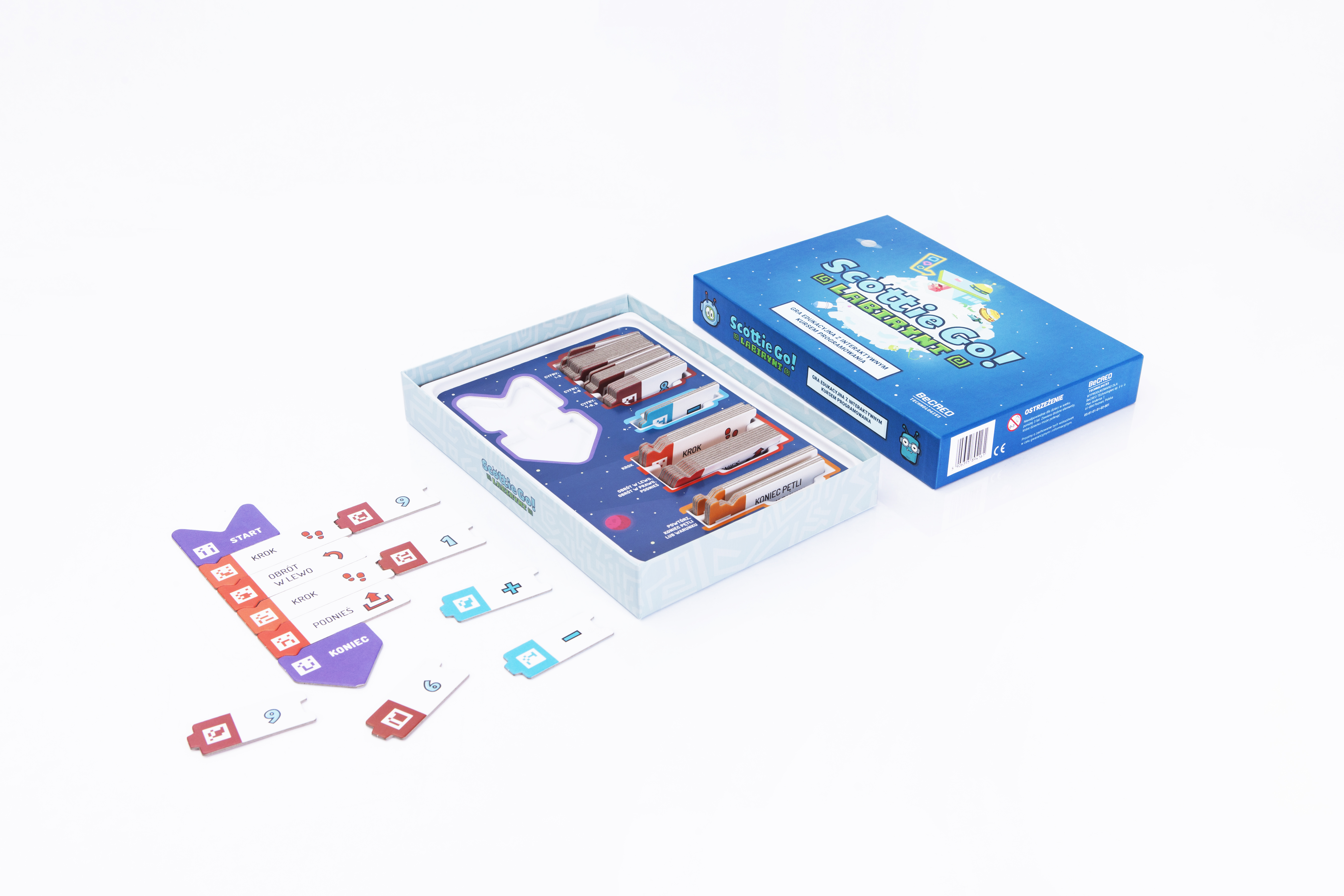 Scottie Go! Labirynt składa się z pudełka z kartonowymi klockami i aplikacji na urządzenia mobilne lub tablety.