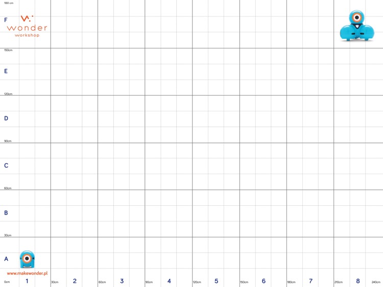 - Mata dla robotów – biała mata jest bardzo przydatna podczas prowadzenia zajęć z dziećmi. Jedna strona maty jest gładka, a druga posiada kratownicę oraz osi współrzędnych. To narzędzie idealnie sprawdza się w zajęciach matematycznych, ale także może być wykorzystana jako miejsce pracy robotów (strefa robotów), na której będą miały rożne zadania do rozwiązania.